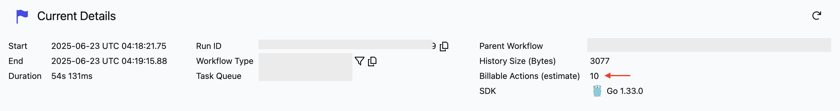 Additionally, Workflows with the TemporalNamespaceDivision Search Attribute set may not have accurate Billable Action Estimates. The estimated Billable Actions should only be treated as an estimate. If billable events exist outside of event history, the Actions count could be higher.